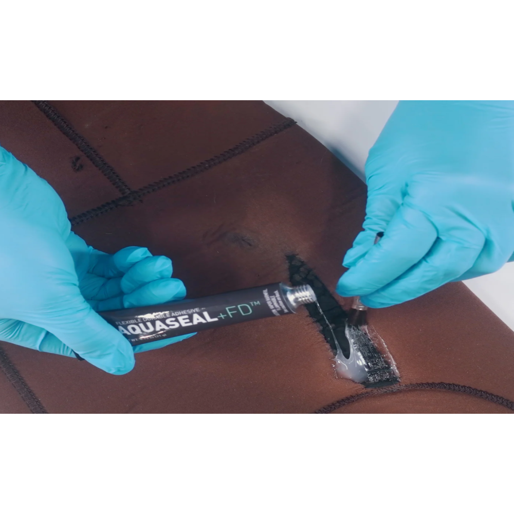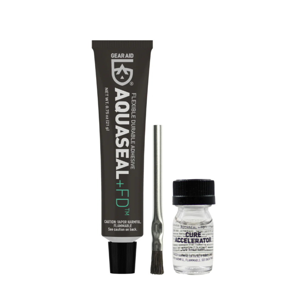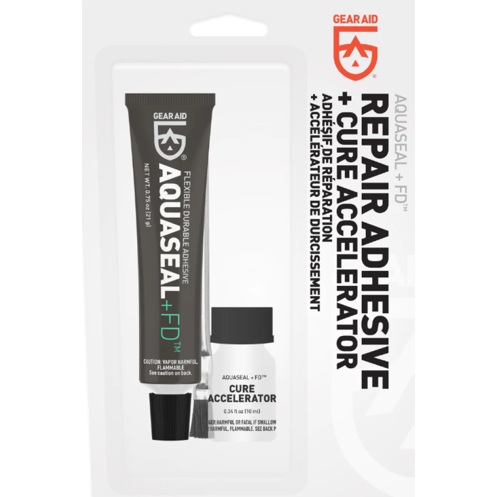 Aquaseal FD and Cure Accelerator is a fast solution for repairing outdoor gear, it improves gear repairs by cleaning the surface and shortening tack time to 15 minutes, and allows the gear to be used again in just two hours. It offers excellent abrasion resistance.